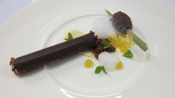 3 Blätter Brickteig in Rechteckige Formen schneiden. Metallrohre mit Backpapier einwickeln, anschließend den Brickteig einrollen. Die Nahtstelle des Teigs mit Läuterzucker einpinseln und auf Backpapier auf einen Blech im vorgeheizten Ofen bei 180 Grad ca. 6 Minuten backen. Die fertigen „Zigarren“ mit dem Tabak-Schokomousse füllen.