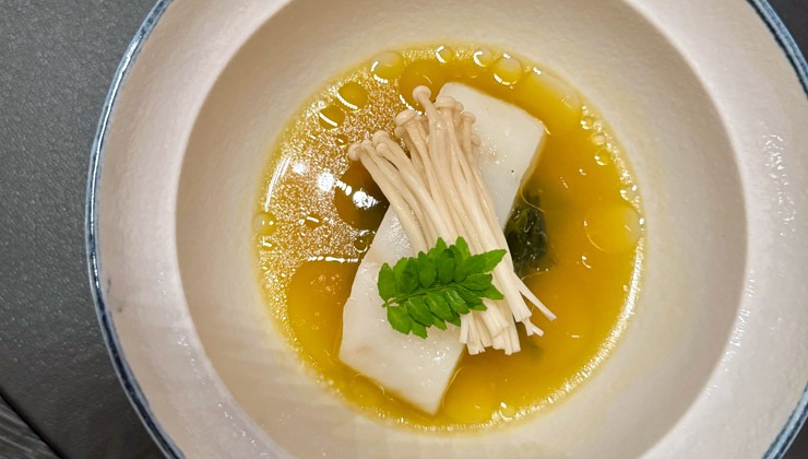 Regionalität definiert Schimkowitsch bewusst weiter. Wild aus der Umgebung findet genauso seinen Platz wie Fisch aus Norwegen oder Japan – entscheidend ist nicht die Herkunft, sondern die Qualität. „Meine Regionalität ist global“, sagt er. Pfälzer Saumagen oder Heimatküche in modernem Gewand überlässt er anderen. Stattdessen bringt er Aromen, Produkte und Ideen aus aller Welt zusammen, ohne sie plakativ zu zitieren. So entstehen Gerichte, die überraschen, ohne zu überfordern. Ein Beispiel ist das Fischgericht „Sakana“ – eine Art edle Suppenküche, inspiriert von japanischer Dashi-Kultur, die aber ganz klar Schimkowitschs Handschrift trägt. Soulfood auf Zwei-Sterne-Niveau.
