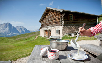 Pieralongia (©Val Gardena/Alex Filz)Eine nur im Sommer bewirtschaftete Hütte ist die Pieralongia-Hütte. Direkt unter den berühmten Geislerspitzen gelegen, hat man auf der Wanderung hier die größten Chancen auf Murmeltiere zu treffen. Bei unserem Besuch hatten wir jedenfalls Erfolg. Sennerin Claudia Hofer bereitet hier oben aus der frischen Milch ihrer Kühe Joghurt und Topfen (Quark) zu. Diesen verarbeitet sie in der urigen Hütte zu einem hervorragenden Topfenstrudel weiter.