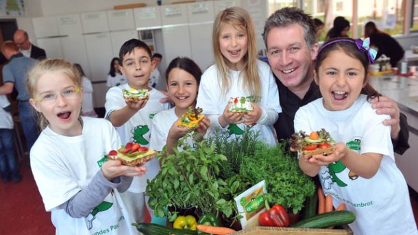 Gemeinsam mit seinen kleinen Helfern kreierte der bekannte TV-Koch hunderte bunte Pausenbrote. Die Kinder hatten nicht nur viel Spaß beim Belegen ihrer Lieblingsbrote, sie lernten obendrein noch, dass das Pausenbrot eine wichtige Mahlzeit im Schulalltag ist. In diesem Jahr beteiligen sich 350 Schulen mit über 100.000 Schülern an der bundesweiten Kampagne „Gesundes Pausenbrot“ von Kerrygold.Der irische Spitzenkoch zeigte den Grundschülern in München, dass ein gesundes Pausenbrot nicht nur lecker, sondern auch kinderleicht zu machen ist. „Besonders wichtig ist das Brot selbst“, sagt Shane McMahon im Gespräch mit uns. Ein gutes Brot enthält viele Nährstoffe wie zum Beispiel Mineral- und Ballaststoffe, welche sich vor allem in Roggenmischbroten oder Vollkornbroten befinden. Im Idealfall wird ein gesundes Pausenbrot mit Butter, Käse- oder Wurstprodukten und Gemüsestreifen belegt. Dazu kommt noch etwas Obst in die Brotdose – fertig ist das gesunde Frühstück. Wir sprachen mit dem Koch über das Thema Brot.