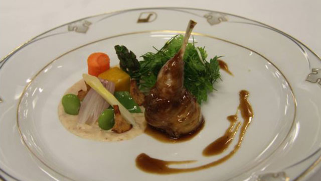 Getrüffelte Ballontine von der Wachtel an Kräutersalat mit weißer Bohnen-Speckcreme und eingelegtem Sommergemüse