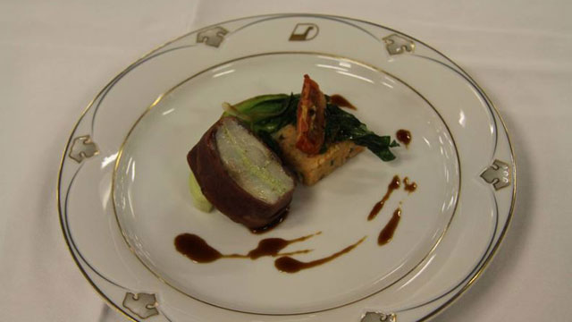Saltimbocca von der Goldbrasse an Noilly Prat Demi Glace mit geschmorten Pak Choi und Tomaten-Pilawreis