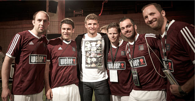 Dass Grillen grundsätzlich nicht in Konkurrenz zu ausgewogener Sportlerernährung stehen muss, wusste dabei auch der Weltmeister: „Auf dem Grill kann man heute ja eigentlich alles zubereiten, was man sonst auch in der Küche macht. Ob das Gemüse ist, Filetsteaks oder Schuhsohlen, die modernen Grills heute bekommen das hin.“Dass Thomas Müller nicht nur Hunger auf Gegrilltes hat, sondern auch auf weitere Titel, zeigt indes seine indirekte Kampfansage an die Kollegen aus der Bundesliga: „Wenn die Saisonvorbereitung losgeht, gibt es keine halben Sachen. Das verlangt der Trainer, aber diesen Anspruch hat man auch sich selbst gegenüber.“ Jetzt genieße er jedoch noch bis zum Trainingsauftakt der Bayern seinen wohlverdienten Urlaub. „Im kommenden Jahr ist die EM, dann ist die Sommerpause wieder kürzer – sofern wir uns qualifizieren, wovon ich jetzt mal ausgehe. Um ein Turnier dann zu gewinnen, muss natürlich einiges zusammenkommen. Aber wir haben ein gutes Team und damit die Basis dafür.“ Momentan ist kicken jedoch nur zum Spaß angesagt – so wie hier beim Weber Original Cup auf einem kleinen Feld und gegen Hobbykicker.